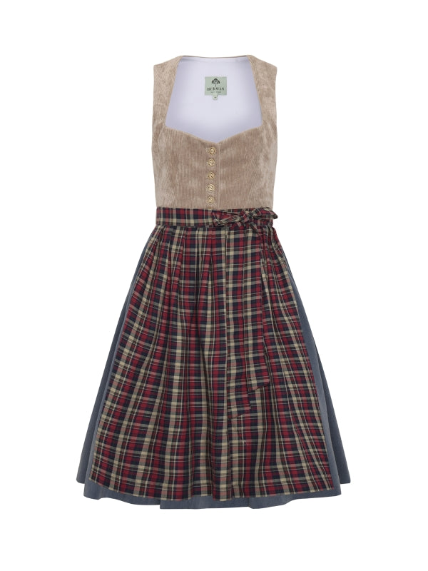 A button-through dirndl with a feminine sweetheart neckline, it captivates with its mix of a soft corduroy top and flowing viscose-blend skirt. The dirndl features a wintery checked apron that adds a classic touch. The pleated skirt offers practical comfort with side pockets. The horn-effect buttons, decorated with laser-cut flowers, add a beautiful accent. With a skirt length of 80 cm, this dirndl is the perfect choice for cooler days and festive occasions.