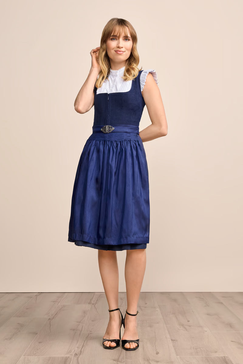The Evi dirndl from our MADL collection harmoniously combines elegance and classic style. The plain-colored bodice impresses with its subtle look and lends the dirndl a timeless charm. The straight neckline underscores the elegant lines and offers space for pairing with a stylish blouse. A special highlight is the simple apron, combining tradition with modern design. The decorative buckle on the apron adds a feminine touch and rounds off the overall look. Two integrated pockets offer space for your small essentials. The dirndl closes with a practical zipper at the front, making it easy to put on and take off. With the Evi dirndl, you'll always have a stylish appearance that perfectly combines tradition and modernity.