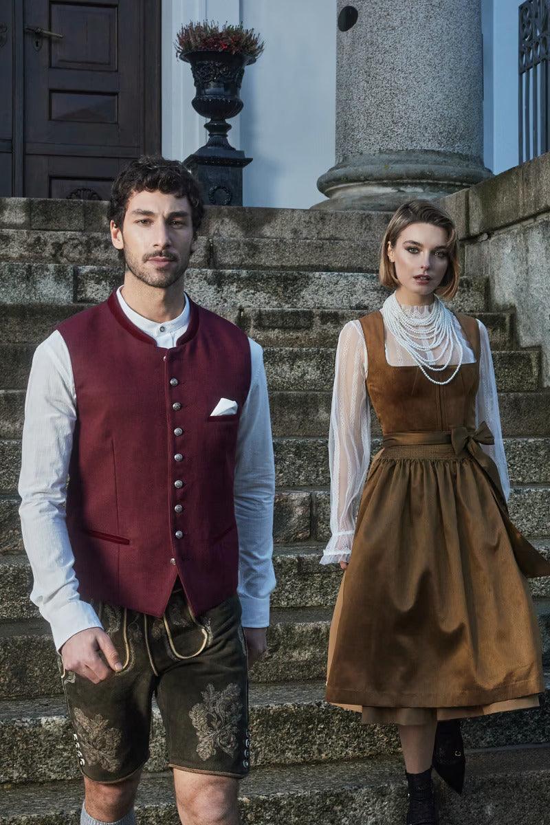 Experience traditional details with a modern twist in our Dirndl Suzanne. This subtle dirndl comes in a tailored style to perfectly showcase your figure. The straight neckline shows off your neckline and the sleeveless design ensures a subtle, modern look. The skirt, with a length of 60 cm, ends at your knee and has two practical pockets that give you enough space for your essentials. The subtle skirt and apron are perfectly coordinated and create a harmonious overall picture with the great velvet bodice. The dirndl is closed at the front with a zipper. In addition, the dirndl does not have a bodice lacing, which ensures a pleasant wearing comfort. With the Dirndl Suzanne you are always perfectly dressed.