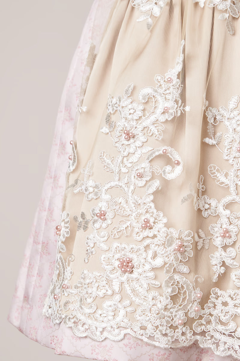 The Blossom dirndl enchants with its floral details. Delicate rose appliqués adorn the neckline. The embroidered pearl apron is the highlight of the dirndl.