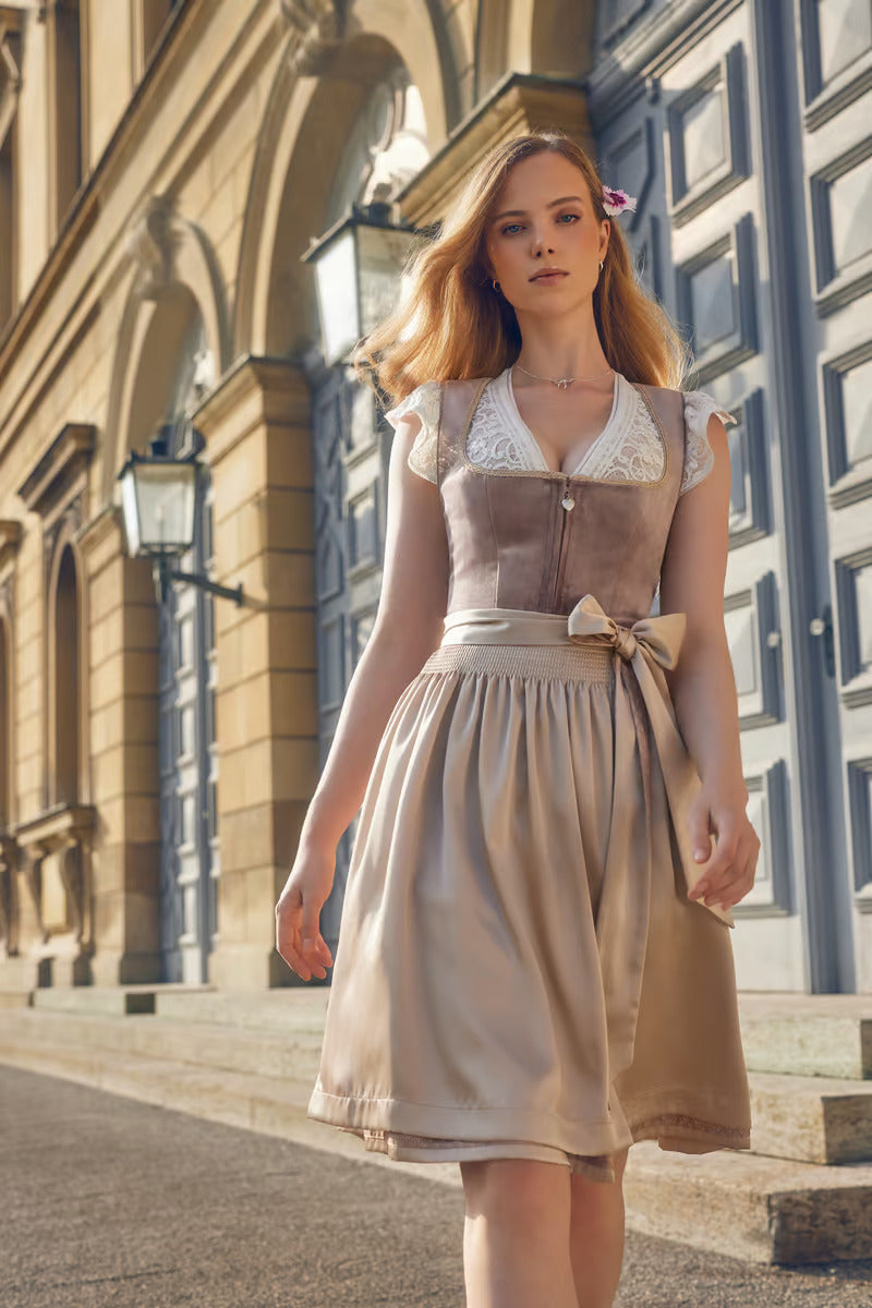 Simple velvet dirndl Dena with a straight neckline and zip at the front. This pretty dirndl immediately impresses with its simple velvet bodice and skirt decorated with ornaments. The simple apron rounds off the overall look perfectly. With a skirt length of 50 cm, the dirndl ends just above the knee. With our dirndl Dena from the MADL collection, you'll be an eye-catcher at any party!