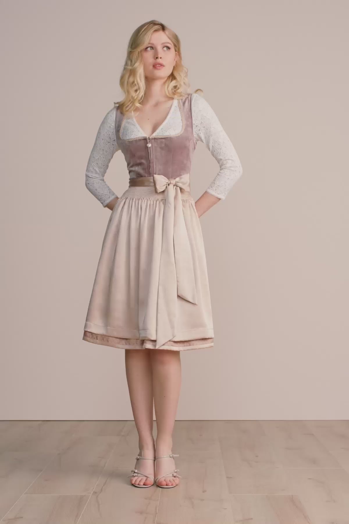The model is 1.72m tall and is wearing the dirndl with a skirt length of 50cm in this photo.