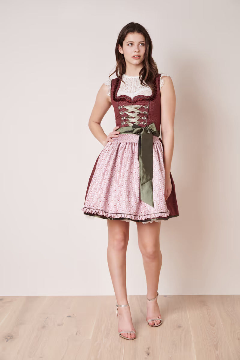 The dirndl Doris enchants with its classic design. The bodice is decorated with beautiful bodice hooks and a sweetheart neckline with delicate borders. The shimmering dirndl apron completes the outfit.