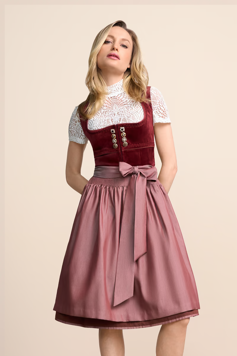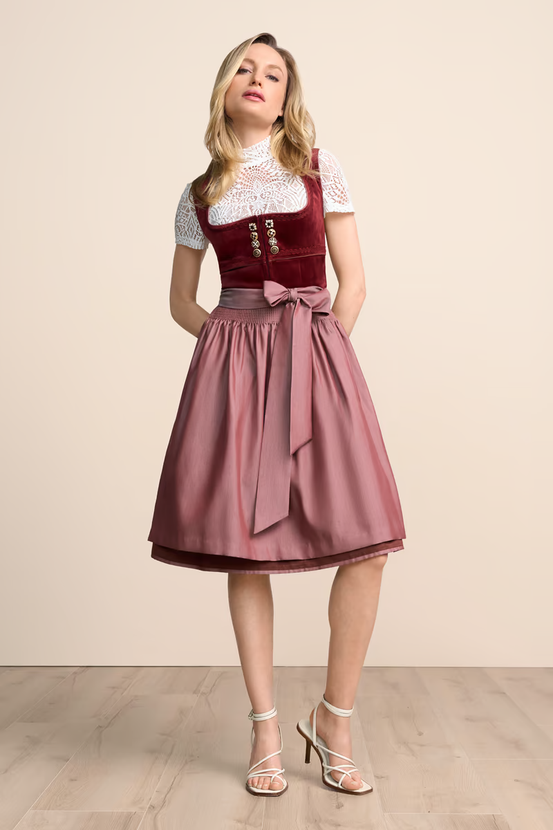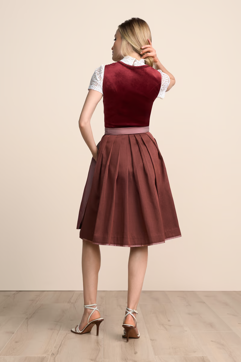 The Milda velvet dirndl impresses with its simple, plain design and tailored fit. The 60 cm long skirt falls to the knee and is equipped with two practical pockets. The straight neckline and sleeveless design give the dirndl an elegant touch. It closes at the front with a discreet zipper, complemented by decorative buttons on the side, lending the dirndl additional charm. Without bodice lacing, it remains simple and elegant. The matching plain apron harmoniously rounds off the outfit. From the latest collection, this dirndl ensures a stylish appearance for every occasion.